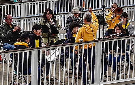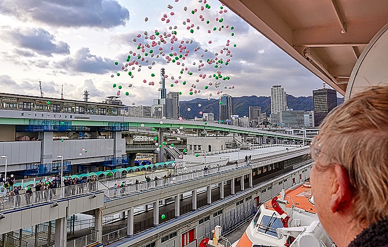 We met our bus and drove back to the port. Our veranda was perfectly situated to watch the farewell festivities mounted by Kobe on the roof of the terminal right by the ship. We were serenaded by the Kobe Hardi Wind Ensemble (which we know because it was printed on the white tuba), although only about half the musicians were actually playing wind instruments. They were a “hardi” group indeed who were bundled up against the cold but were still there playing when we left the dock. At one point pink, white and green balloons were released into the air and there was a fellow nearby waving what looked like naval signal flags, whose meaning we do not know (but we would guess something like “farewell”). Families and children were there as well, many carrying balloons. As we pulled away from the dock they struck up “Anchors Aweigh.” Much fun and a great send off.