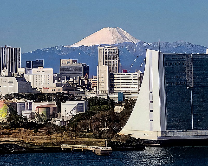 We arrived at the new cruise port in Tokyo around 8:00 AM on February 28 for a two day stay. You may have read that, although the iconic Mt Fuji is more than 60 miles away, it can be seen from Tokyo. That’s true, but not most of the time because rain or hazy weather in Tokyo or the clouds often generated by the mountain’s own weather system hide the view more often than not (and some say much more often than not). But it was a very clear morning as we approached the dock and there was a stunning view of Mt Fuji. At least there was if you were on the port side of the ship. Alas, we were on the starboard side and had no idea this was even happening until much later in the morning when the mountain was behind nearby buildings. But our friend Jean was on the port side and she shared this picture taken from her veranda (I have enlarged the portion of the photo containing the mountain).