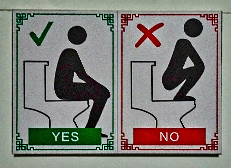 Since we are talking about a restaurant, this is probably a good place to mention one more thing about touring Asia . . . toilets, or rather the lack thereof. People in many parts of Asia, even in cities, squat over a hole in the ground for this purpose and have never seen a Western style toilet. If one has never used one, encountering a toilet must be bewildering. Here is a sign over a men’s room toilet in China which helpfully explains how it is used even for visitors who are illiterate. The picture is quite suggestive of the common response when no such instructions are available.