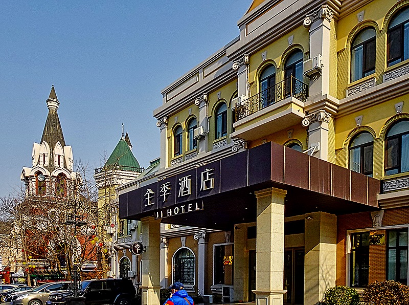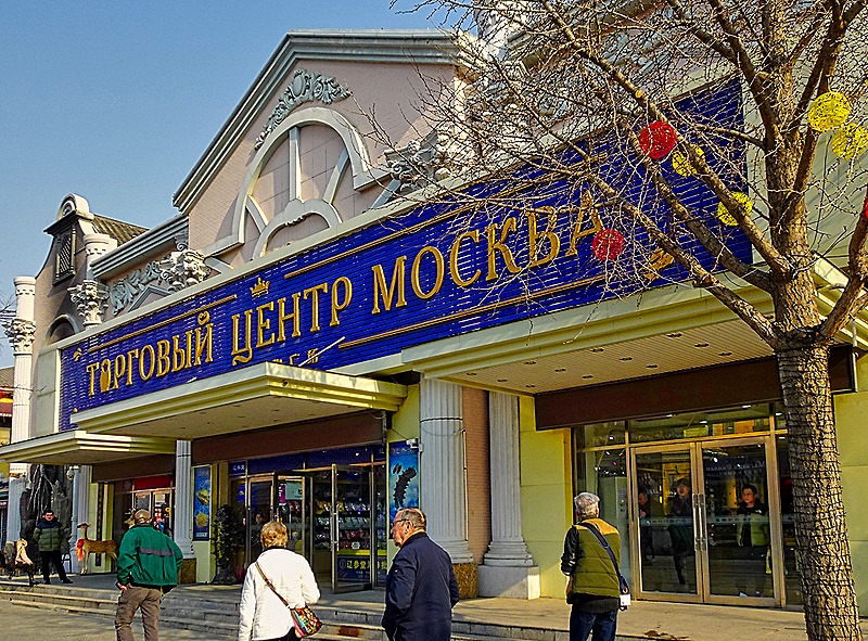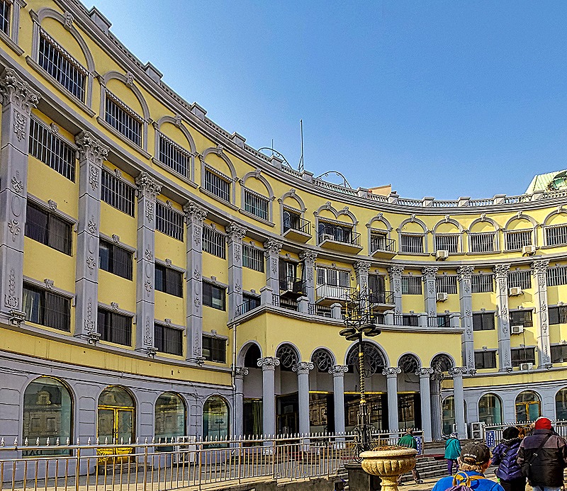We spotted the main entrance to the Russian street and walked over to take a look. The large arched sign was over a wide avenue leading straight to the original Russian city hall. There was a big crowd there (and we didn’t know what that building was at the time) so we didn’t get close to it. If we had, we would have seen that it is much bigger than this picture seems, stretching out to the right and left.