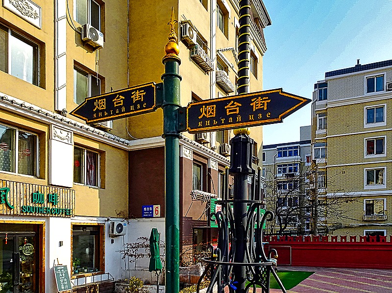 Dalian was originally built by the Russians beginning in 1895 and named Dalniy, replacing a small town called Qingniwa. Russian Culture Street, which we visited first, is the oldest street in town. Several of the buildings erected by the Russians were still there in 1999 when Bo Xilai, the mayor of Dalian, began the project to restore this district. Russian architects were employed to renovate eight old Russian buildings, add so-called Russian facades to six other buildings and build six new buildings in a Russian style. For the most part we don’t know which buildings are old and which are new, but none of them look Chinese (except for the signs outside them in Chinese). The area is somewhat atmospheric, but also highly commercial with many vendors selling tourist items you might expect to see in Eastern Europe rather than in China. We reached Russian Street through a side entrance, walking under a sign that is apparently lighted at night.