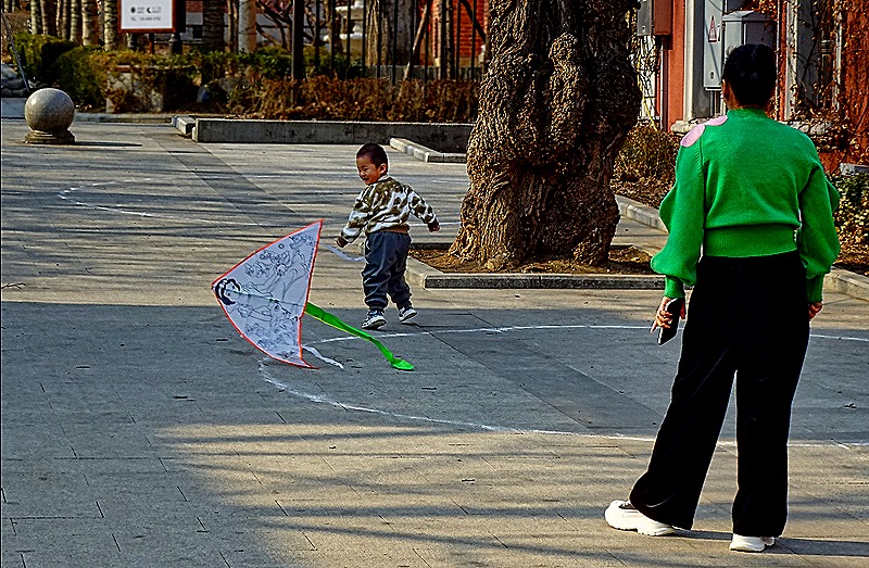 It was Sunday morning and bright and sunny (but rather cold) so as time went on more and more people were out and about. We stopped to watch a mother trying to teach her son (presumably) how to fly a kite.