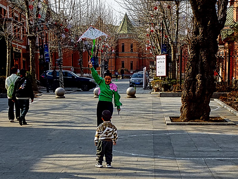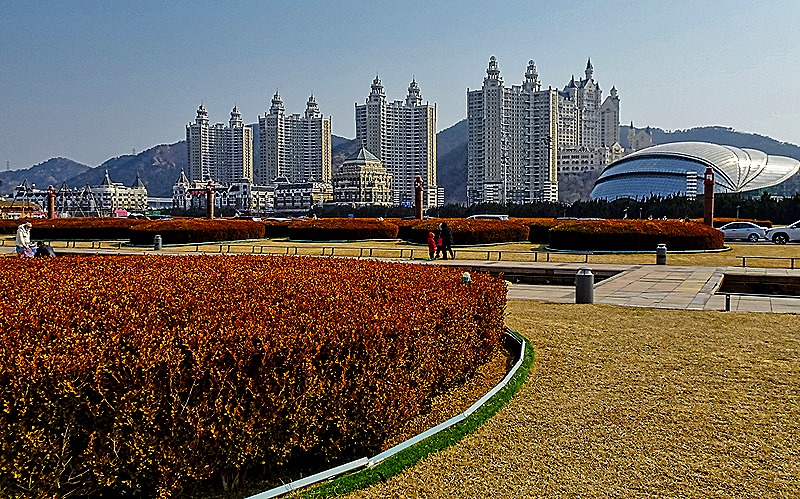 The square has a very large lawn area and is landscaped in bushes which, at least when we were there, were red. The red bushes really stood out against the yellow grass. Kite flying seems to be popular in Dalian; we saw a number of people flying kites, many quite high in the air.