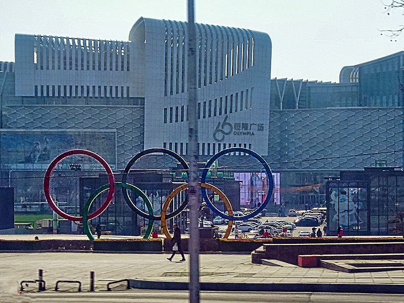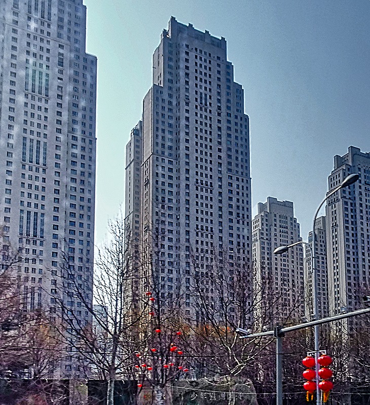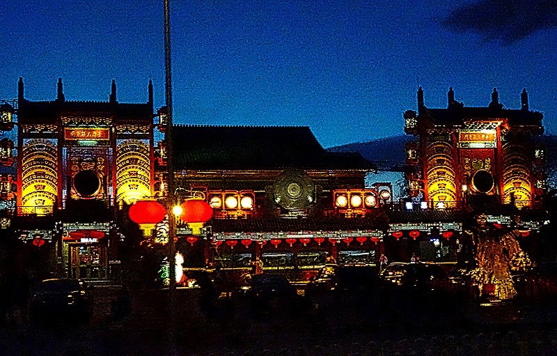 As we drove through town to our next destination we noticed that the whole town seemed brightly decorated with red lanterns and balls (balloons?). Among other things, we passed what we think is Olympic square, built in 1998 in anticipation of the 2008 Beijing Olympics.