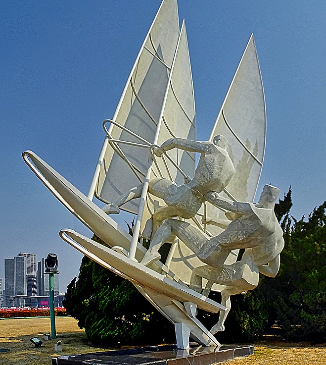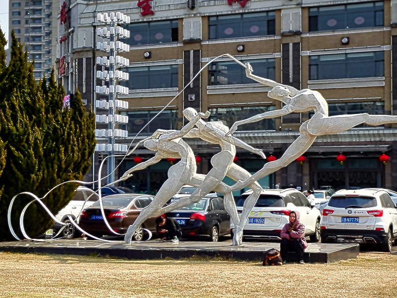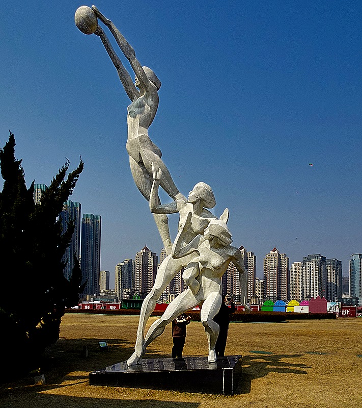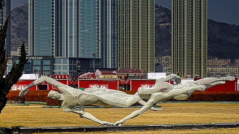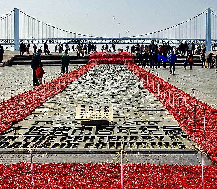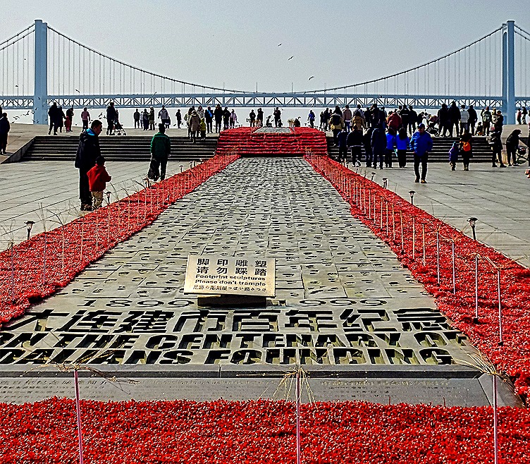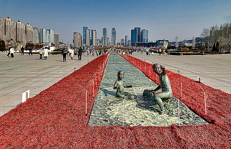 Leading up to the Centennial City Sculpture from the square’s interior is the long and low copper Sculpture of 1000 Footprints. It was completed in 1999, marking the centenary of the city’s founding. The footprints were made by Dalian citizens, starting with people born in 1899 and progressing toward the water with footprints of people born in 1999 at the end. Also at the end is a sculpture of two children who appear to be playing in the surf. When we were there it was surrounded by what looked from a distance like a bed of red flowers, but on closer inspection it appears to be some kind of carpet (look closely in the pictures and you can see some wrinkles).