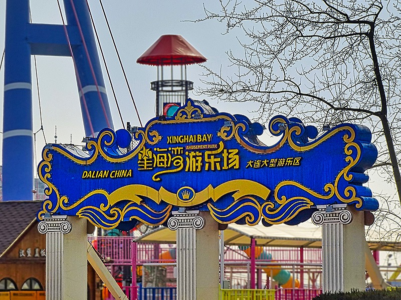On one side of the square is the Dalian Shell Museum, opened in 2015. The building is shaped like a clam shell, slightly opened where the windows are placed. Next to it is the colorful Xinghai Bay Amusement Park.