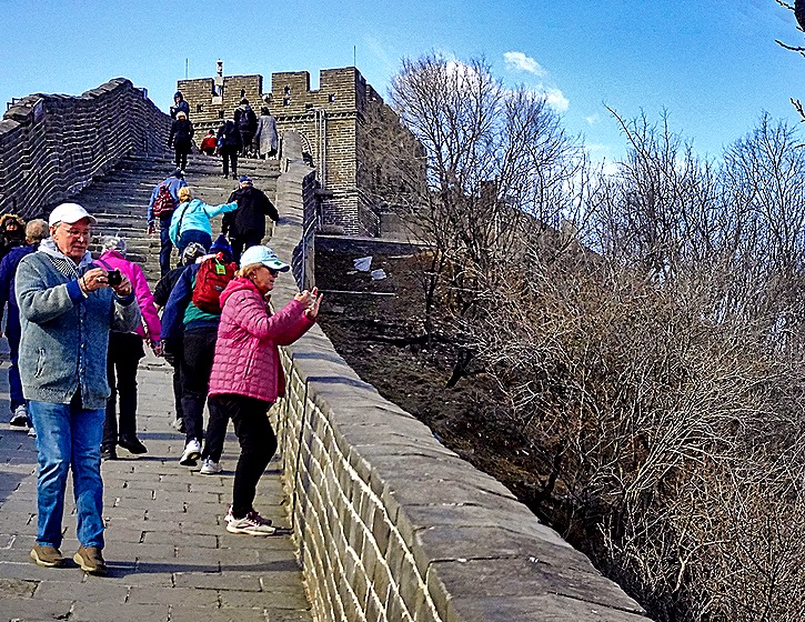 Note how few people are on the wall in these pictures; it almost seemed that the site had been reserved just for us! You can also see that the wall is crenelated on one side (which allows archers to fire through the openings without exposing themselves to enemy fire). Presumably the crenelated side faces away from China toward the enemy; the shadows show that this side faces west. This is very mountainous country and the wall undulates up and down with the hillsides. Among other things, this makes exploring the top of the wall challenging since it requires climbing some very steep inclines, steep enough to have steps in them. At the tops of the inclines are watchtowers and signal towers. . . tens of thousands of them across the entire distance of the wall.