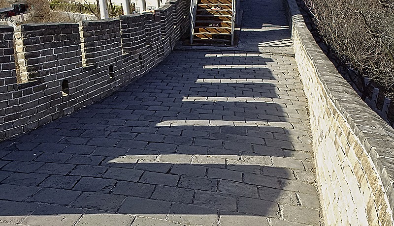 The Badaling section is the best restored and maintained portion of the Great Wall. Because of that, and because it is the closest to Beijing, it is often very crowded. In 2018, we have read, 10 million people visited this site and in 2019 a limit of 65,000 per day was instituted. We were extremely lucky in our visit, because not only did we have beautiful weather and clear air that allowed long distance viewing of other portions of the wall, but also (at least partially because we arrived in late afternoon) there were very few people other than our group in the area. A funicular here (this is the only section of the wall that has one) took us up the steep hill from the parking lot to just below the wall itself.