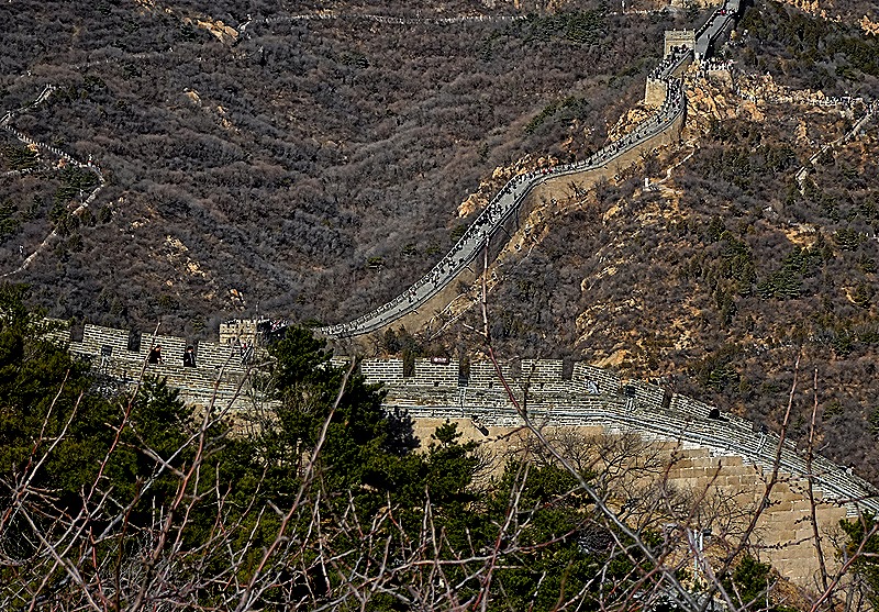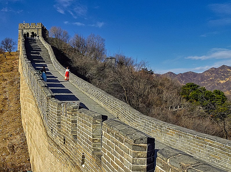 The Great Wall of China is more than 13,000 miles long. The first sections of the wall were built between the 8th and 5th centuries BCE, mostly of earth and stone. In the early 3d century BCE, however, the first emperor of a unified China had these walls destroyed because they were no longer at the border of his empire, and built new walls further north. Most of these ancient walls have eroded away long before now, with some of their materials carted away for use in other construction. In the 14th century CE the Ming dynasty began building a new wall along China’s northern border to defend against the Mongols. This wall was much stronger, built primarily of bricks and stone rather than packed earth. The Badaling section of the wall that we visited was built in 1504 and was the first section opened to the public in 1957. It is about 25 feet tall and 16 feet wide.