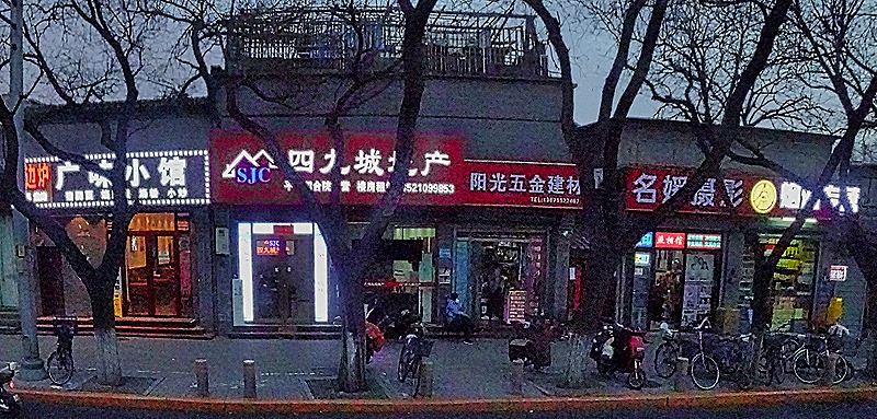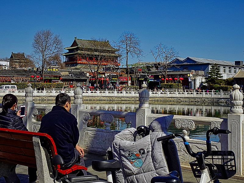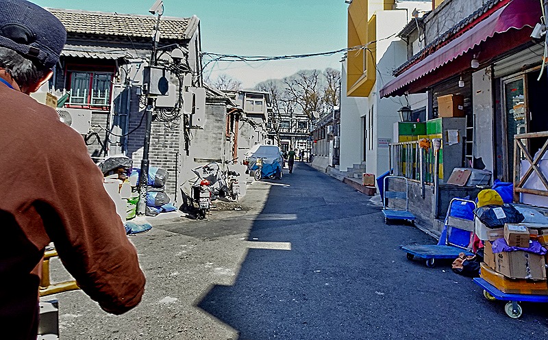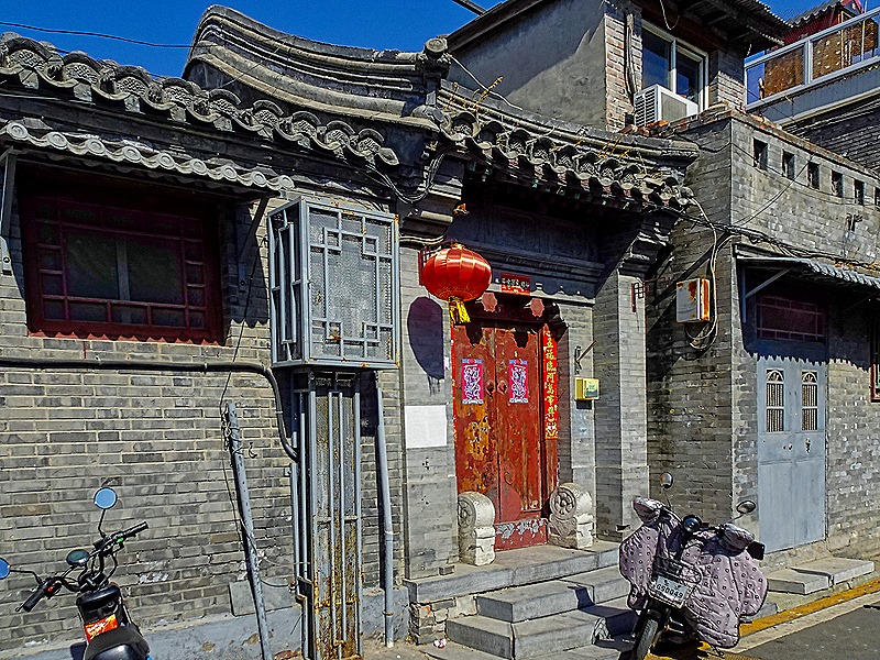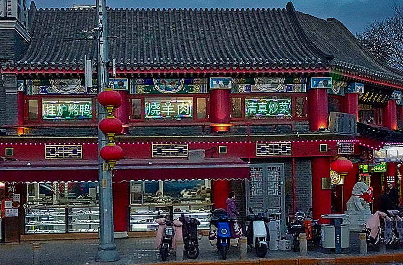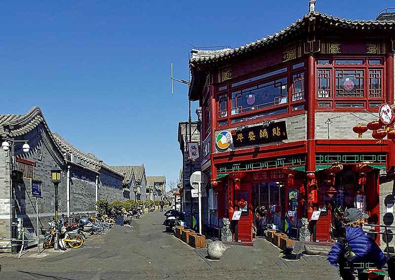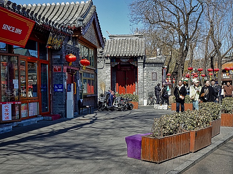 We saw several two story buildings lining the roads, mostly stores it seemed. We have read that the old Siheyuan are almost all single story buildings and the two story emulations have been built in recent years, many for commercial uses.