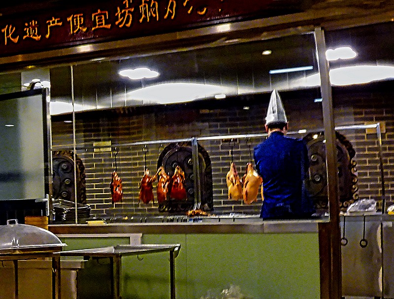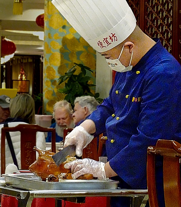 We had dinner in a Chinese restaurant where each large round table had a lazy susan in the center for sharing the many courses. The signature dish was Peking Duck (our guide explained that it is still called that even though the city is now Beijing). Many cooked ducks were hanging in the open kitchen and we watched the chef carving ducks not too far from our table. Yum.