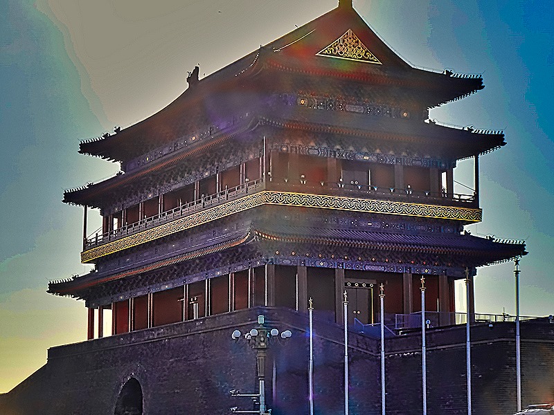 The Tiananmen itself (“Tiananmen Gate” is redundant, since “men” apparently means gate) is a widely recognized symbol of modern China. First built in 1420, this “Gate of Heavenly Peace” has been damaged or destroyed and rebuilt several times, most recently in 1970. It is 217 feet long, 121 feet wide and 105 feet tall. Across the front are two large inscriptions in Chinese: the left one means “Long Live The People’s Republic of China,” and on the right “Long Live the Great Solidarity of the World’s Peoples.” In front, between the building and the street, is part of the old Imperial moat that still surrounds the Forbidden City with carved marble bridges leading over it to the entrances. Decorative fountains shoot up from the moat on each side of the building. Over the main entry is a huge painting of Mao Zedong, which weighs 1.5 metric tons.