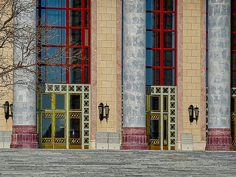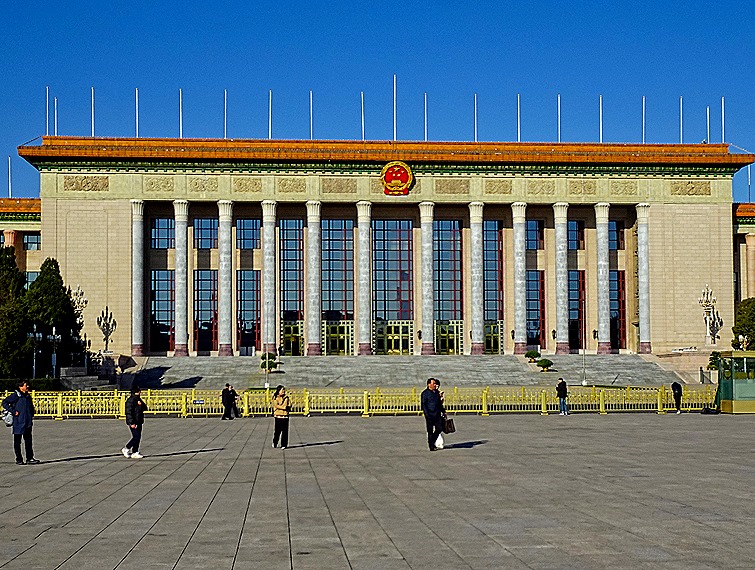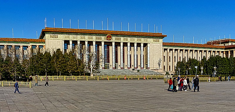Along the western edge of the square is the Great Hall of the People, meeting place of the National People’s Congress and the National Congress of the Chinese Communist Party, along with other official and ceremonial functions. Its construction was completed on September 9, 1959. A large building with a long and low profile, it is 1,168 feet long and 677 feet wide.