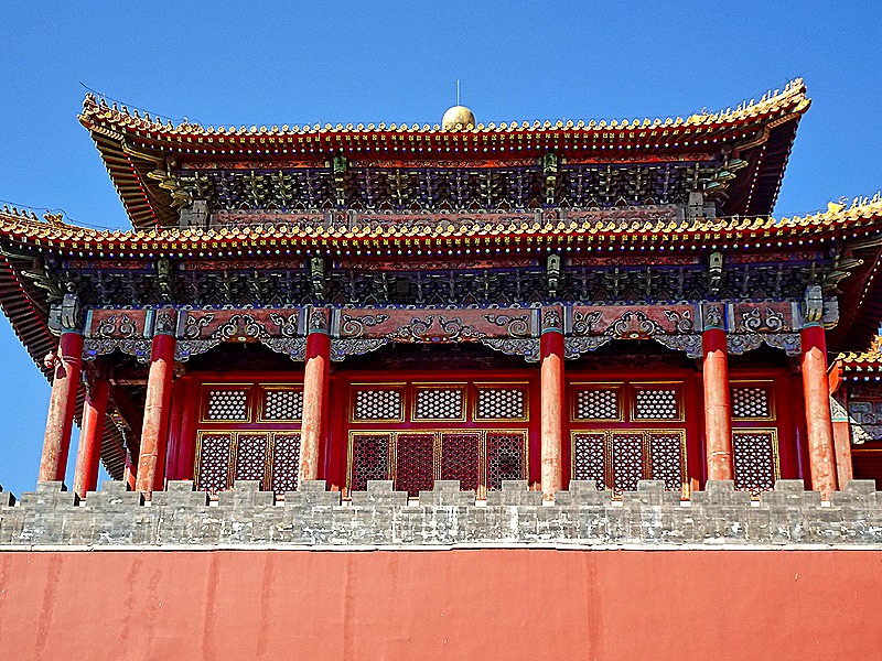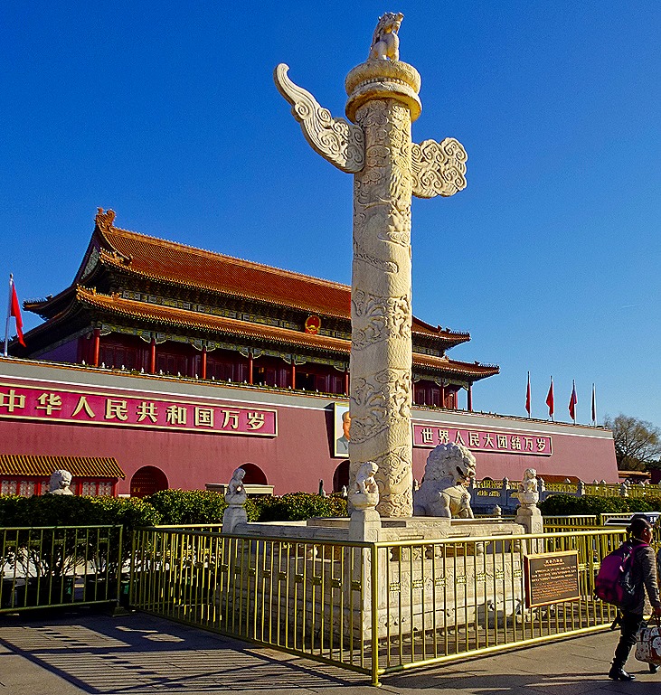 Most people reading this will probably associate this square with the violent suppression of student democracy protests in 1989, in which it is estimated that hundreds (some say thousands) were killed. In China no one speaks of this in public and most Chinese are not even aware that it happened. It is our understanding that the only public entrance to the Forbidden City requires walking across this huge square to the entrance below the painting of Chairman Mao. So that is what we did. Walking along we passed the Monument to the People’s Heroes, a 125 foot tall obelisk completed in 1958 and saw the National Museum of China behind it on the eastern side of the square. The museum, first opened in 1959, is the largest single museum building in the world. It has a vast and varied collection and it looks like one easily could spend a day or two just exploring this museum. We did not have that kind of time, so walked on by. In the center of the square just south of the Monument is Chairman Mao Memorial Hall, the mausoleum that is his final resting place. It was completed on May 24, 1977, about 8 months after Mao’s death.