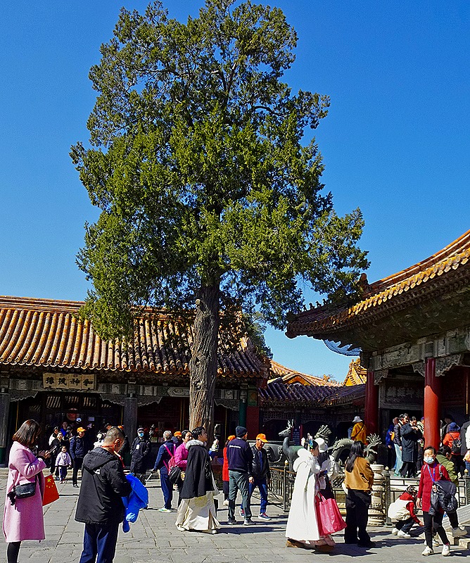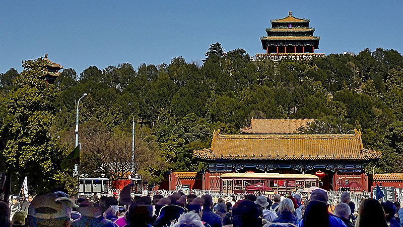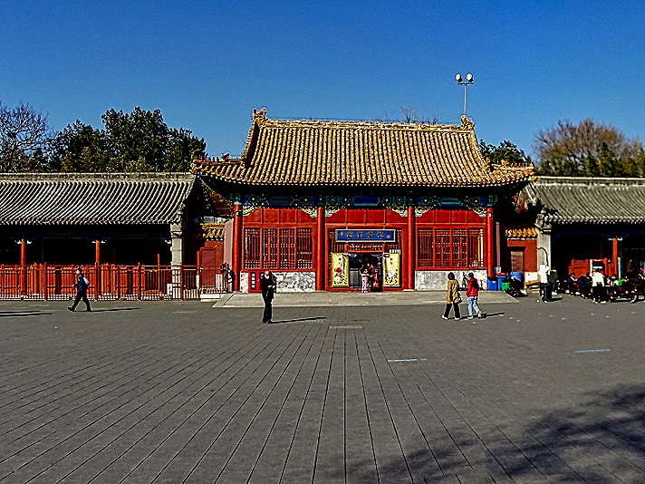 We left the Forbidden City through the Gate of Divine Might opening on a view of Jingshan Park across the street. What you see is an artificial hill (considered the highest point in Beijing) built in 1751 from soil excavated when digging the moats and canals in the Forbidden City. It was originally a private domain for the imperial family but was opened to the public in 1928. At the top of the hill, above the entry gate across the street from us, is the Wanchun Pavilion which sits on the central of five summits on the hill. To its left on another summit is Guanmiao Pavilion, which we were able to see over the roofs of the last part of the Forbidden City. From the Wanchun Pavilion on a clear day one has a panoramic view over the rooftops of the entire Forbidden City, but we didn’t have time to climb the hill to see that.