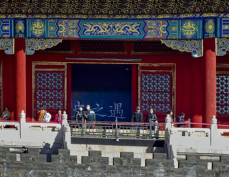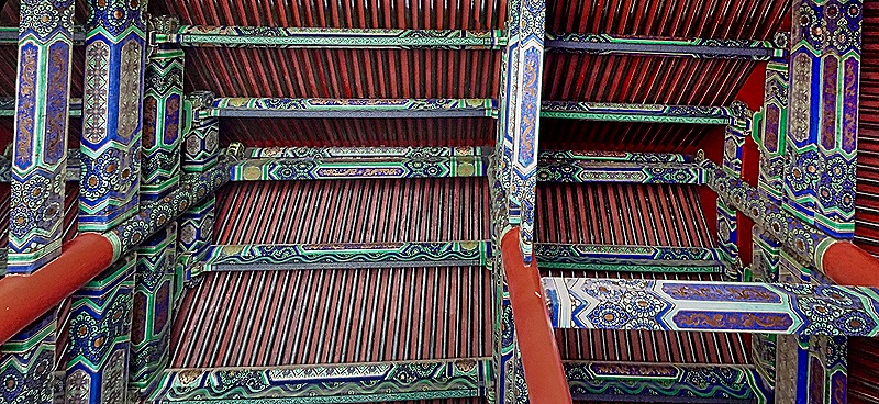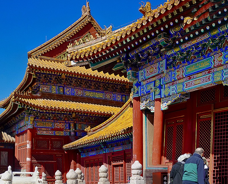 Behind the big hall is the much smaller square shaped Hall of Central Harmony. We walked through a small gate to the side of the Hall of Supreme Harmony to reach it. Walking through another gate we looked up and saw its elaborate ceiling, made of wood with mortise and tenon joints. And nearby were several side buildings with gracefully interacting eaves. Behind the Hall of Central Harmony is the larger rectangular Hall of Preserving Harmony.