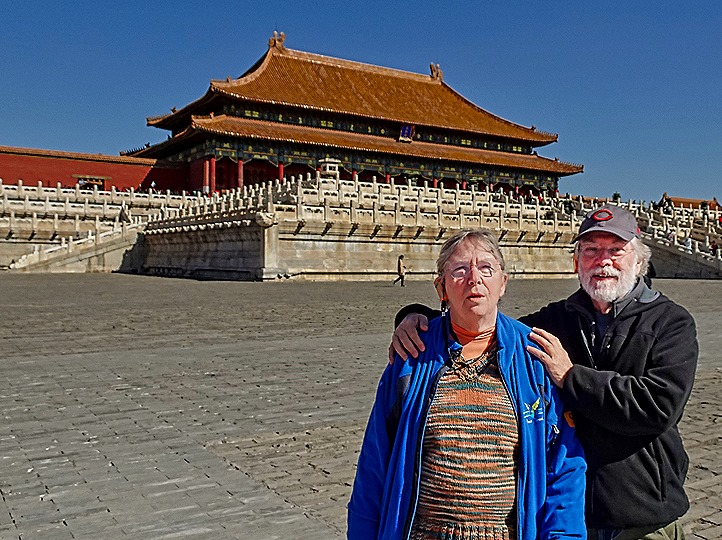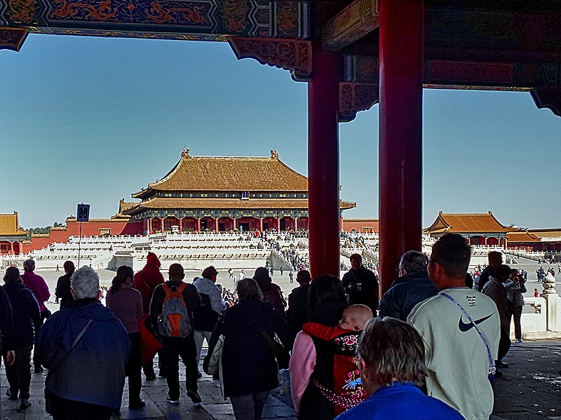 We finally walked through the Meridian Gate. There was a security check inside the gate where we had to show our passports and (if I remember correctly) walk through a metal detector. A bit irritating because there was a line, but not a big deal. Except for our travel agency’s host Susie. She was taken aside as the rest of us went on through. She was detained for about half an hour before being allowed to rejoin us, causing some concern because no one told us why. It turned out that she was carrying all our tickets for the Forbidden City and whoever had filled out a form to accompany them had miscopied one of the digits in her passport number so that they didn’t match. One of our guide’s assistants made the trip back to their office to obtain a corrected form, stepping up like a pro to fix the situation. We were all glad to see Susie finally return. Enough excitement for one day!
