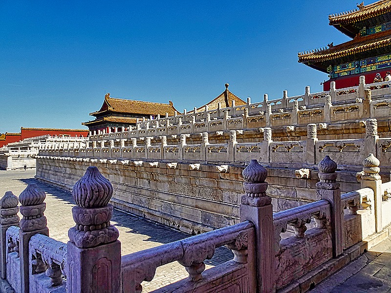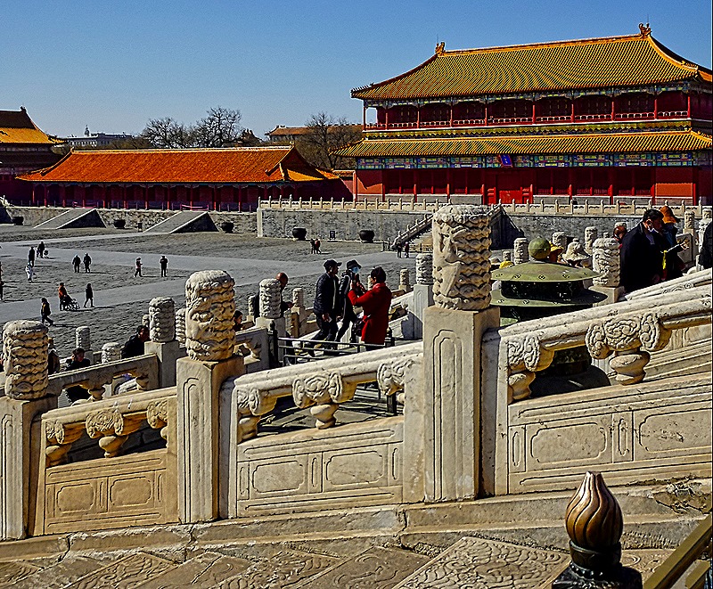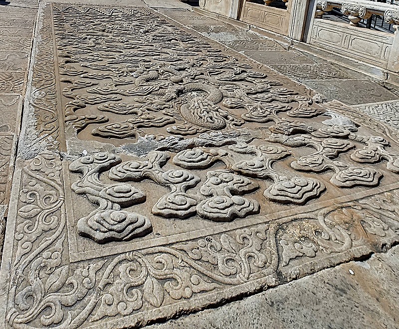 The carved marble staircases and veranda fencing were quite beautiful in themselves, with dragon heads lining the bottom at floor level serving as rainwater runoff spouts. It was quite a view from the veranda down the steps and across the courtyard to the Gate of Supreme Harmony through which we had entered. The central carriageway is covered with intricately carved marble reliefs. Back in the day, no one but the Emperor was permitted to use it.