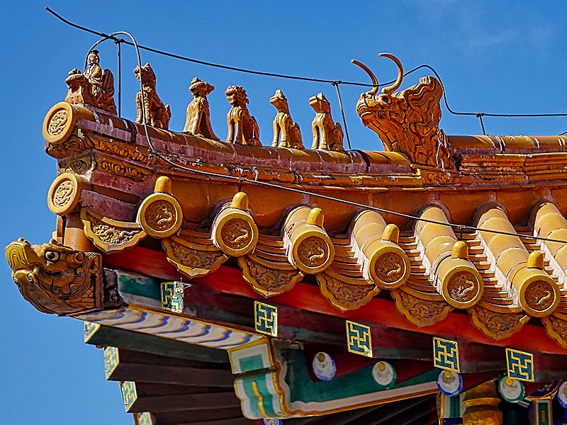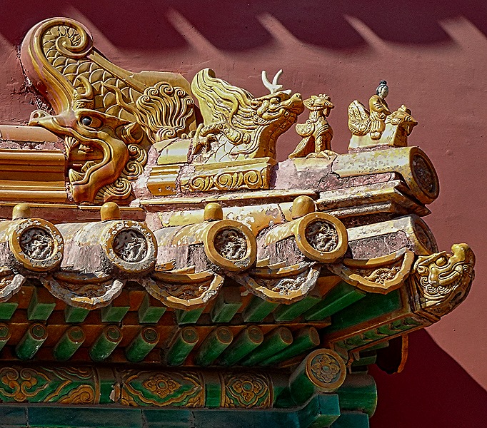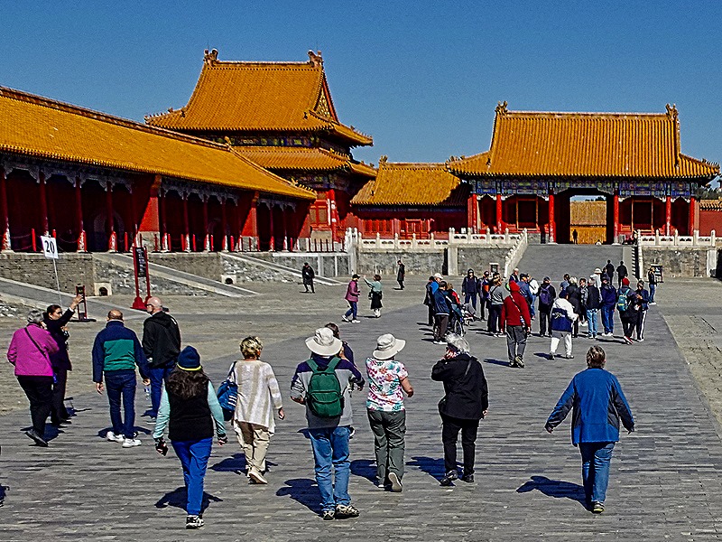 We spent quite a bit of time in this courtyard before being permitted to move on to the next one. The courtyard is surrounded by buildings in traditional Chinese style, much red, green and yellow. Yellow roofs like those seen on some of these buildings were permitted only for the Emperor’s buildings. Notable here and on other buildings are the decorations on the ends of the roof eaves, made up of a row of golden animals, including dragons, phoenixes and lions. They are quite beautiful and the number of animals indicates the importance of the building, from just a couple to as many as nine. The long rows of buildings along the sides of the square used to be administrative offices. Young men in uniform were in this courtyard to keep order, and as the courtyard got more crowded we were all required to stand in parallel lines, with each set of visitors in a different line headed by its guide carrying a numbered white sign.