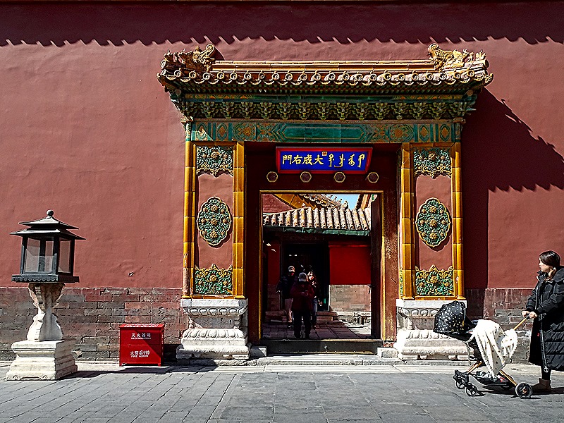 Of course, what we were all waiting for was our turn to go through the Meridian Gate. Unlike all the other gates in the Forbidden City, the Meridian has large side walls stretching forward along the sides of the courtyard like the arms of the Sphinx, each with a building on top. The Meridian Gate is the actual entrance to the Forbidden City proper.