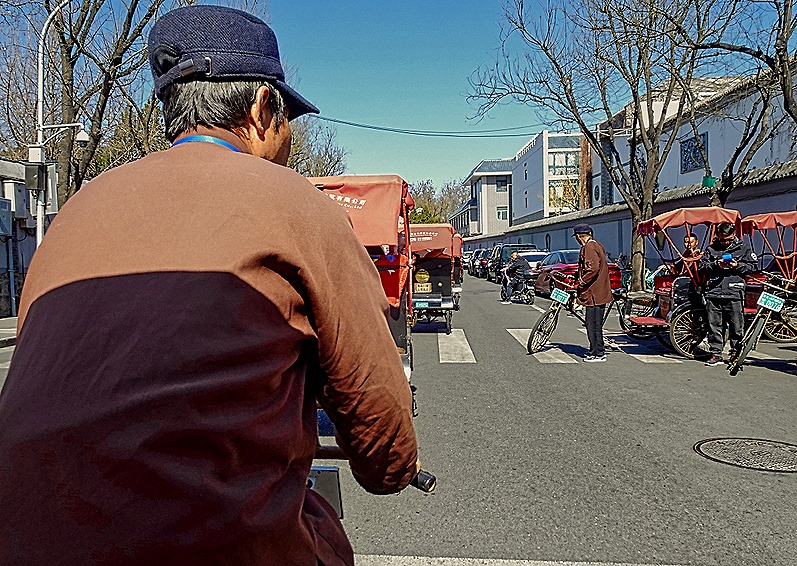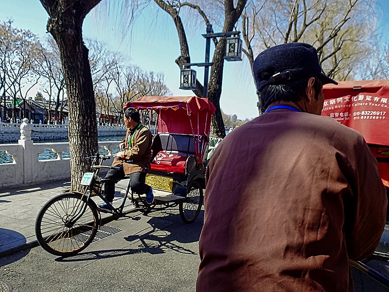 We can’t tell you which hutongs we visited but most of them were lined with what seemed like continuous gray walls with periodic openings or doors, mostly red. We understand that these are very tight communities (after all, most people living in them meet at the public bathrooms), with much visiting, conversation and game playing. Some are very narrow and some very wide . . . from a couple of feet to perhaps 100 feet in width.