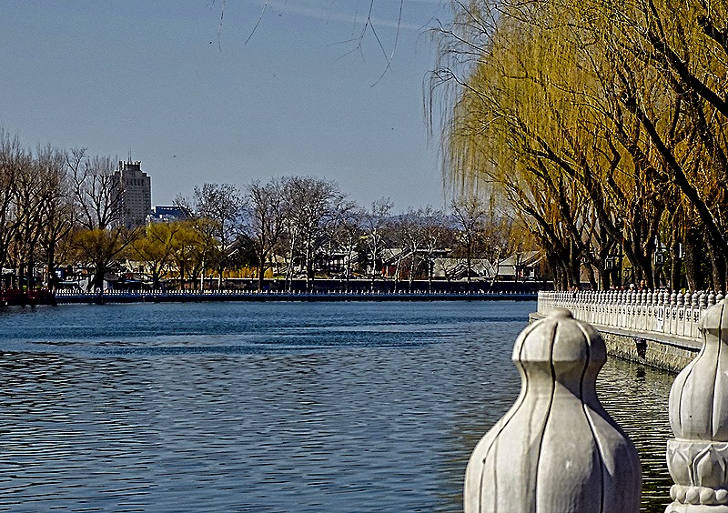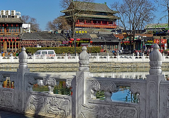 Our ride took us along Shichahai Lake. In the 13th and 14th centuries this was the northern terminus of the Grand Canal (discussed in our visit to Suzhou: https://baderjournal.com/2024/08/26/shanghai-china-day-2-suzhou-2024/) and was then a bustling commercial area. After the canal was extended to other destinations it became a noted scenic area, the largest body of water in Beijing and lined with green trees. We noticed that it is also lined with stone walls that look very similar to the ones lining the Golden Water channel running through the Forbidden City and wonder if the two are connected. Today the area is becoming a mecca for popular bars and restaurants. On the day we visited the water was still and reflective.