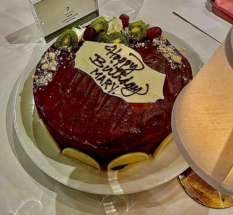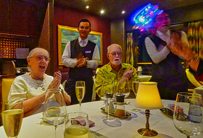But the biggest event during these days was Mary’s 75th birthday on March 15, the day before we reached Hong Kong. We had originally planned to commemorate it by going to tea at the Peninsula Hotel on our second day in Hong Kong, but it turned out that would not have fit into the time available before our early departure that day, maybe next time. So we ended up celebrating at our usual table in the main dining room with our usual table mates: Bill, Robert, Bob & Judy. Robert provided a birthday cake and the restaurant staff, and some of the diners, sang the Indonesian birthday song. Robert (as usual) also provided the fireworks.