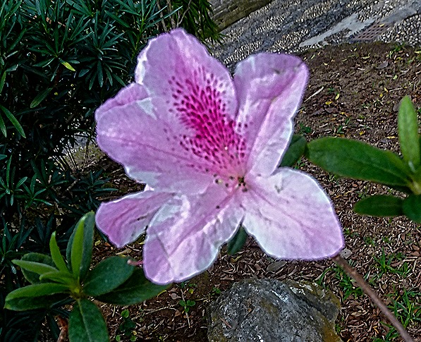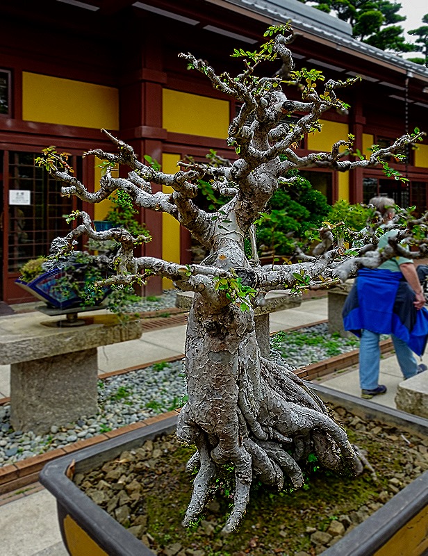 Reentering the gardens we continued along the path, passing a gallery, souvenir shops and restaurant. The gallery was quite elegant with a number of beautiful (and pricey) items of art. In front of these shops were more bonsai and flowers and at the end an (artificial) waterfall.