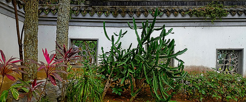 We walked past several other buildings. One that we think may be the Fui Sing Pavilion, had a nice moon gate inside a pavilion extension. Nearby was Guibi Rock, a stone quarried near Suzhou, whose name comes from its resemblance to ancient jade. It is difficult to miss the neighborhood skyscrapers towering over the perimeter wall of the garden, and there are several graceful moon gates and windows throughout the park.
