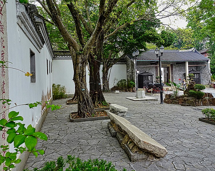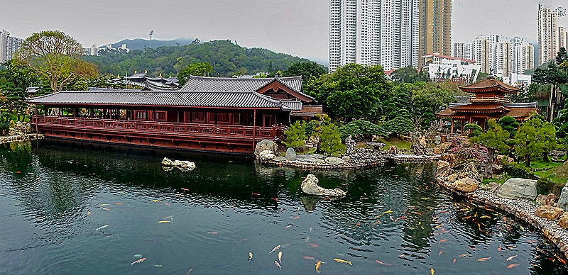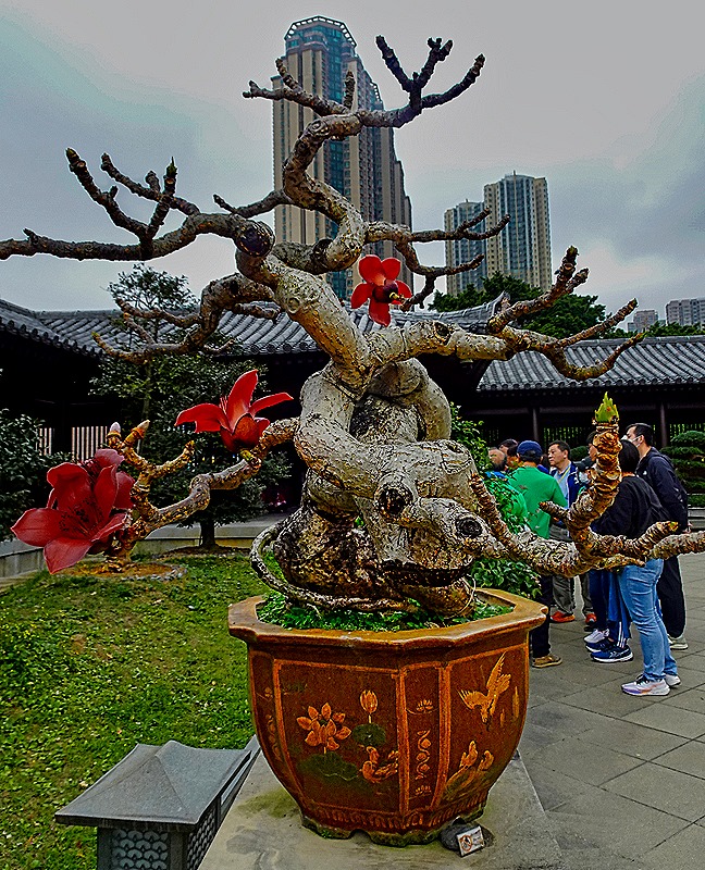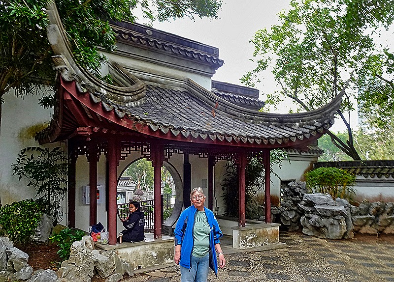 Our first stop was at Kowloon Walled City Park. This enclave’s history dates back to the 15th century when the Chinese established a military garrison to manage the local salt trade. It became a fort in 1810 and in 1847, after the British took control of Hong Kong island, a strong defensive wall was built. In 1898 China agreed to give the UK a 99 year lease on a Hong Kong concession extending for 200 miles . . . except for the Walled City that remained under Chinese jurisdiction. Chinese troops were withdrawn the next year but the British did little to control the area. The walls were demolished by the Japanese occupiers in 1943 to obtain stones to extend runways at the airport (now our cruise terminal). After the war the area was inundated by refugees from the Chinese civil war, who wanted to avoid British jurisdiction by staying in this nominally Chinese enclave. The rapidly increasing population density (some 3.25 million per square mile in a 1987 census, the most densely populated place in the world at that time) along with the failure of Britain and China to police the area, led to it becoming a haven for crime of all kinds (including, for example, unlicensed “doctors” and “dentists”). After decades of false starts, the population was moved out (finally overcoming their longstanding resistance) and the densely packed buildings were demolished in 1993 under an agreement between Britain and China. The almost 8 acre park we visited, which once had hosted more than 500 10-12 story buildings, opened in 1995.