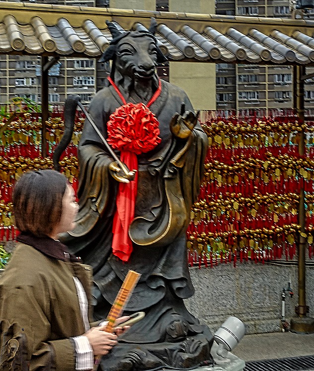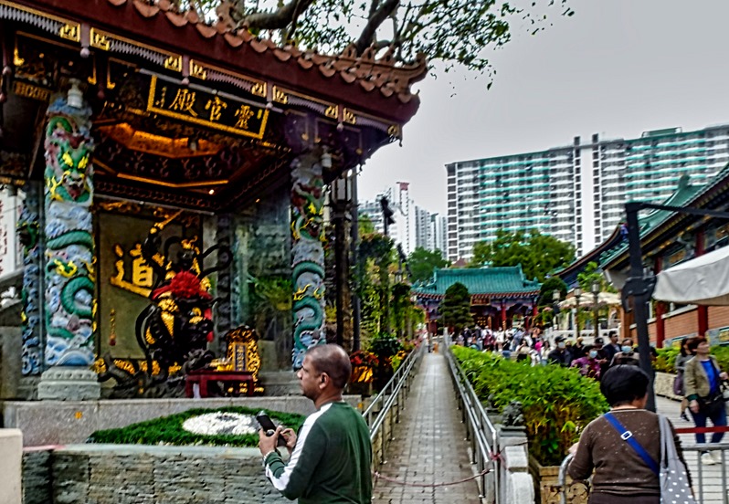 Our second visit was to the Wong Tai Sin Taoist Temple. This place was quite interesting, but boy was it crowded. Wong Tai Sin (meaning “Great Immortal Wong”) is the deity name for a 4th century Chinese Taoist hermit. He was largely unknown in Hong Kong before 1916 when an immigrant from Guangdong province set up an herbal medicine shop in Kowloon with an altar to Wong Tai Sin in the back. Patrons could pray for advice at the altar and then the proprietor would sell them the recommended medicines. In 1921 he said he received instructions from Wong Tai Sin to construct a shrine. He and his coreligionists were told through divination exactly where and when to build it. It was funded by four rich businessmen who had probably been happy users of the herbal medicines. While Won Tai Sin was a Taoist, the temple accommodates Buddhist and Confucian worshippers as well.