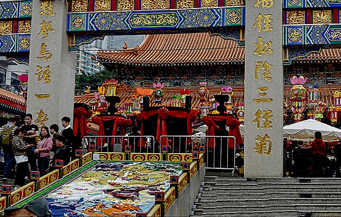 Another larger stone gate was at the top of the broad stairs leading to the Great Hall, the main Taoist temple. The center portion of the stairway was filled with what looked like a very colorful relief, perhaps a map? The plaza in front of the Great Hall had a number of red cushions for kneeling, most of which were in use, and an array of Chinese lanterns strung overhead. To its sides were kiosks for worshipping and also for obtaining and burning incense sticks.