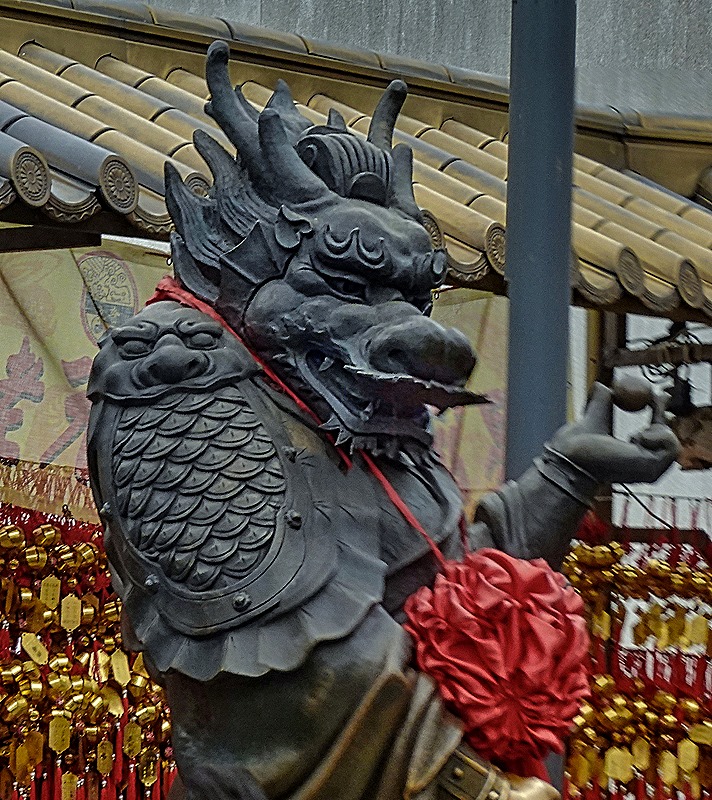 The small parking lot was quite crowded and we had to wait for a spot to open up. Then our driver exhibited his notable skill by backing us into a barely accessible spot. We had to walk a good way to the entry gate of the temple, which had dragon statues on each side that were shiny bronze (probably), where people rubbed them for good luck on the way in. Then we passed a number of black statues of Chinese zodiac animals, about 6 feet tall. Some were wearing large red ribbons, perhaps for a special occasion but we don’t know what. Inside the gate was a small altar pavilion with brightly painted and carved pillars, possibly dedicated to seeking good luck.