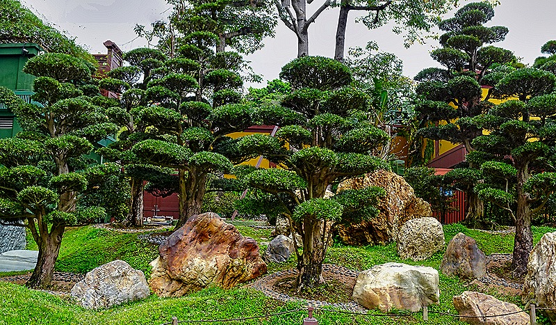 We walked around a white building with a row of bonsai trees along one wall and some cactus in front of another. The patio in front was covered in stone pebble mosaics and there were flowers around.