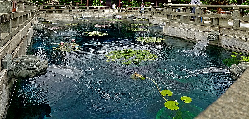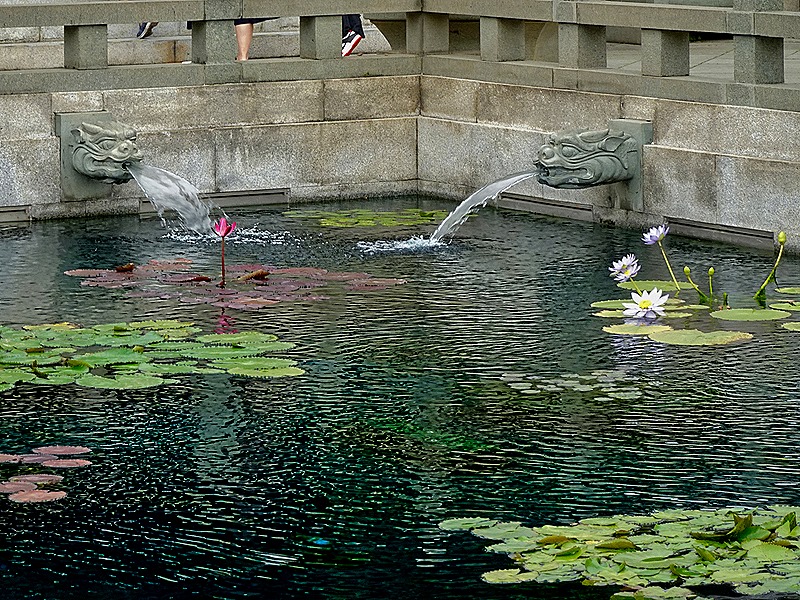 Exiting the Hall we had a nice view of the whole plaza surrounded by wooden buildings. In the plaza were several stone lotus ponds fed by lion head spigots and a number of bonsai trees.