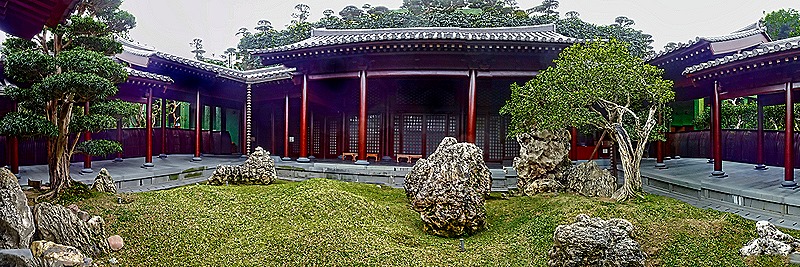 Turning the corner to head back to the entrance we came to the Blue Pond, a scenic lake full of orange koi. Along one side is the long Song Cha Xie, a tea house, and on the upper right is the Pavilion Bridge. Further along we came to the Xiang Hai Xuan Multi-purpose Hall, which had a very nice rock garden in its interior courtyard.