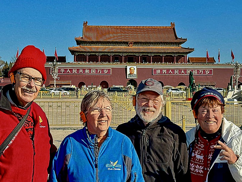 We woke up early in our hotel room on March 12. Already in Beijing, at least there would be no long bus ride to get there, but we were scheduled to check out and leave at 7:30 for the short ride to Tiananmen Square to try to beat most of the crowds that visit there every day. And before that was a vast buffet breakfast with many Chinese and Western foods, far more than anyone could even sample before a long day of walking. I was more than satisfied with a couple of croissants. We checked out of our hotel, quite beautiful inside with many flowers, and boarded the bus.