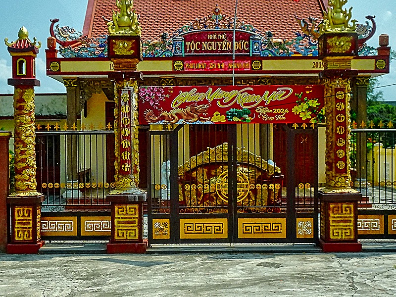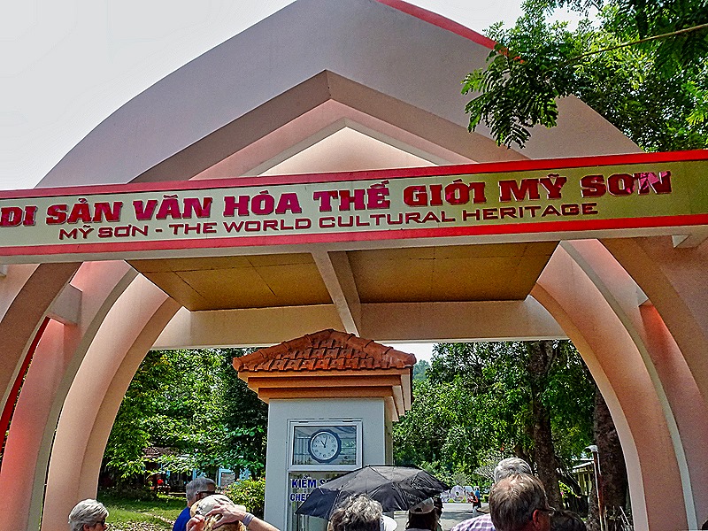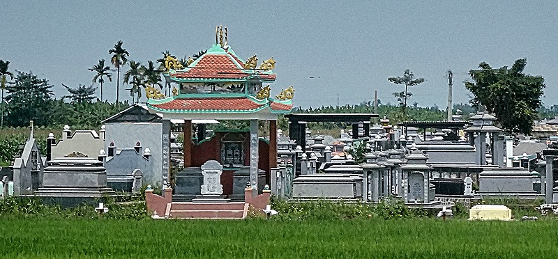 We spent March 19 docked in Da Nang, the third most important city in Vietnam with a population of about 1.3 million people. It is the most important port in central Vietnam, becoming that only when the Vietnamese king barred western ships from entering the previously dominant harbor of Hoi An. We visited Da Nang previously in 2016 for an overnight stay. We spent the first day in Hue, the last imperial capital: https://baderjournal.com/2016/04/10/; we spent the second day in Hoi An: https://baderjournal.com/2016/04/13/danang-vietnam-day-2-hoi-an/, Today our prime objective was the ruins of the ancient temple complex of the Cham people in My Son. This was about a two hour bus ride away, so we got started early. Passing through small towns and countryside we saw some interesting buildings, including several cemeteries, and a class of schoolchildren.