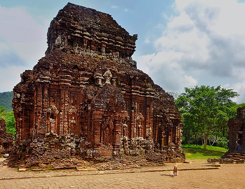 While we have been calling this a temple complex, not all the buildings are temples. There are storage buildings, perhaps some living quarters for religious personnel and the Champa monarchs were buried here, so there may be some tombs. Unfortunately we can’t really tell you which buildings are which, but it seems that the larger buildings are the temples and the smallest ones the storage units. These structures are built mostly of red brick and held together by a substance that is not visible from the outside. Originally, in the 4th century or so, temples here were made of wood. But a huge fire destroyed them early on and after that brick was used instead. Some of these buildings rise to a narrow, almost blunt, top. But others are topped by what looks like a smaller building with a saddle shaped roof.