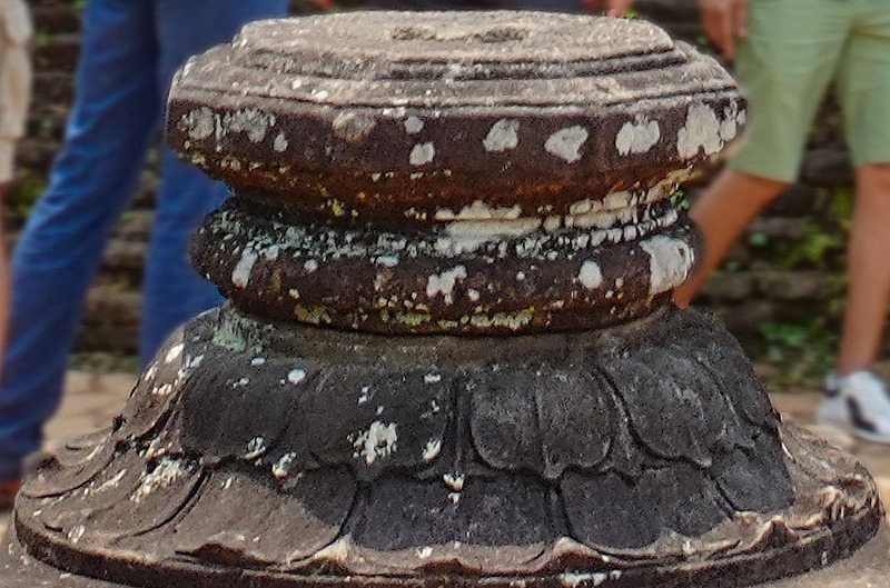 The Cham people often included a phallic fertility symbol called a lingam in their temple complexes. Sometimes these are reduced to a cylinder shape, and they are sometimes enclosed in a metal cover called a Kosa which can have relief decorations. Some of them are gone and only the round base remains.