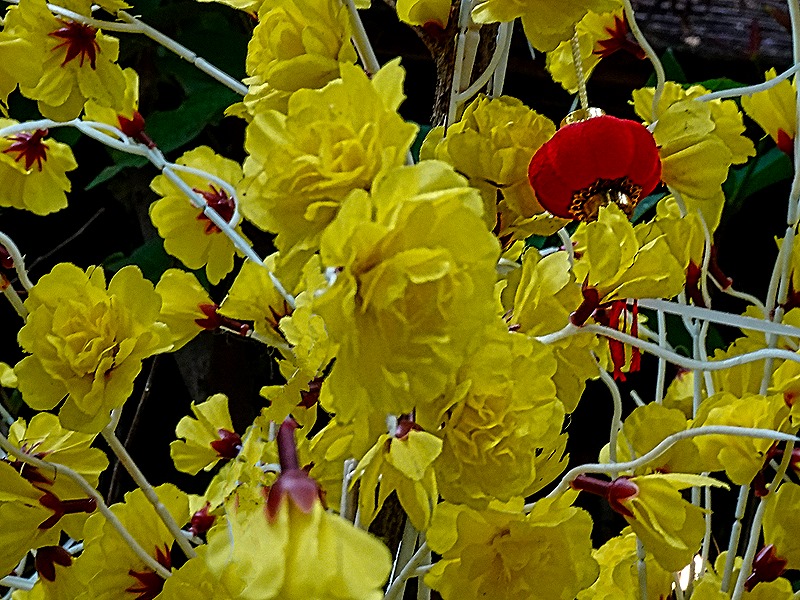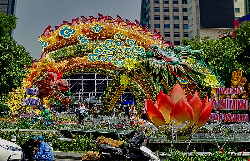 We walked down this park to where we would meet the bus. The park was decked out in festive attire, with a colorful sign welcoming people to Saigon for the Spring (if we understood correctly). As we neared the Bitexco Tower we passed streets jammed with motorcycles, a common sight in this area of the world.