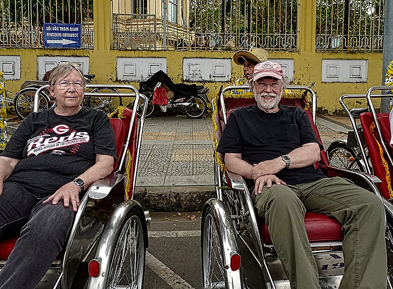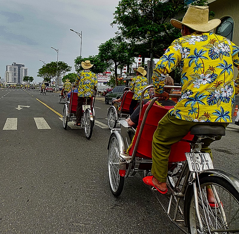 After lunch it was time for a rickshaw ride through this neighborhood and up along the river. We had a rickshaw tour of the Hutongs in Beijing just a week before, but this time it was one person per vehicle, the driver was behind instead of in front and, of course, it was an entirely different city in a different country. Our rickshaw drivers wore a uniform (of sorts) consisting of a cowboy hat and a loud Hawaiian style yellow shirt with palm trees. Very subtle.