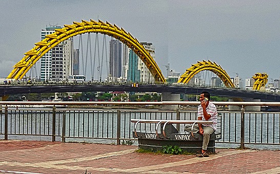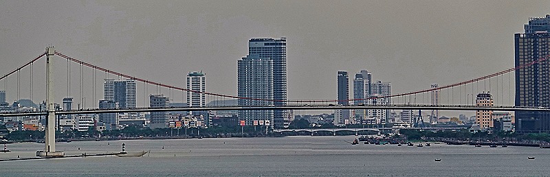We returned to the ship, from where we had a wide view of the harbor with many fishing boats. The Thuan Phuoc Bridge, Vietnam’s longest suspension bridge at 1850 meters, which opened in 2009. The Tran Thi Ly Bridge has a single pylon and cables reaching out in both directions looking like a sail. When we saw it the cables looked red but we understand that it sometimes gets more colorful. We sailed away at about 11:00 after a rather fiery sundown.