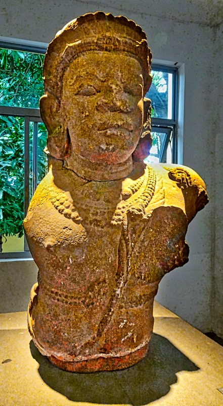 Some of the notable items there were a sculpture of Vishnu with four arms, a stone panel with a relief of the god Yaksa with curled hair, a sandstone guardian demigod dvarapala stomping on a bull, a 7th century male dancer carved into a step leading up to an altar pedestal, and a god (or goddess) sitting with hands on knees, possibly Lakshmi. Buddhism came to Champa late in the 9th century and the museum had an impressive display surrounding the largest Cham statue of Buddha on record.