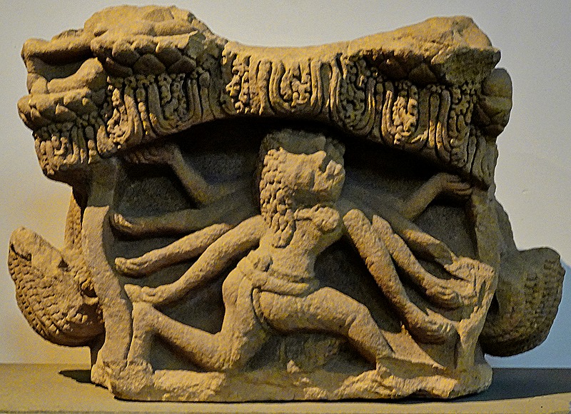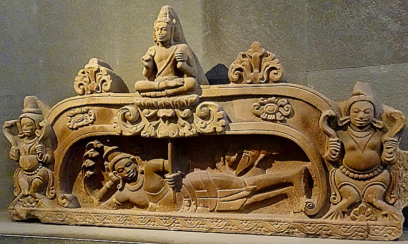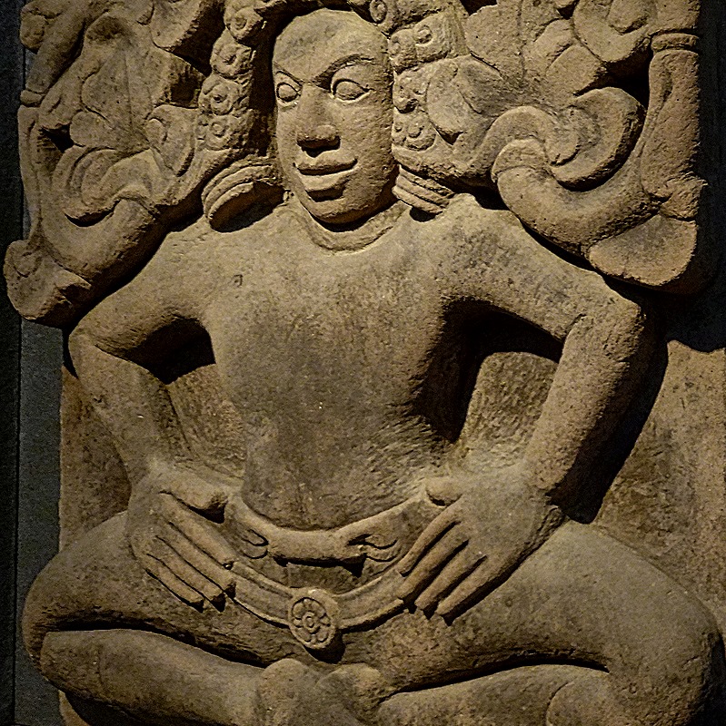 In addition to individual sculptures there were a number of excellent reliefs carved into the edges of platforms or pedestals. The first picture here is of a pediment showing the birth of Brahma from a lotus flower growing out of Vishnu’s navel. We have read that the second one, depicting a dancer and musician (who may be goddesses) wearing many strings of beads and whose clothing is evidenced only by a cloth hanging between their legs, is considered one of the Chan masterpieces. The third is a flute player that is a detail from a much longer platform edge. Next are, apparently, two depictions of the goddess Durga, and below them is a platform edge showing the court of Champa, with the king in the middle and apparently a number of dancing women.