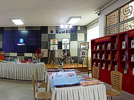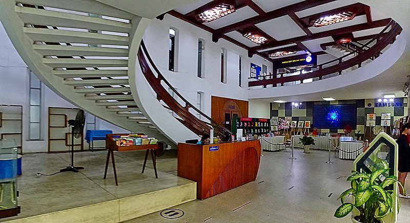 We stopped to visit the Hồ Chí Minh City General Sciences Library. Built on the site that had held a somewhat notorious prison since 1865, this library opened near the end of 1971 as the National Library (in South Vietnam). It was renamed the General Sciences Library 1976, shortly after reunification of North and South Vietnam. The building has a white facade with an abstract design and looks very much a mid-century style. It is surrounded by a narrow moat and a nice park where people were eating or reading.