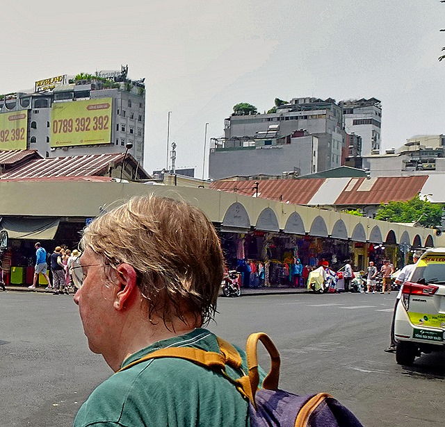 We wandered on, generally in the direction of the Ben Thanh market, a large single story building housing many individual vendors (Mary bought a hat there last time). On our last visit we had been impressed by the silk embroidery for sale in a shop not far from this market and we were hoping to find it again. There had been a lot of construction in this area when we were here before and we weren’t certain we could find the shop, whose name we had not written down, particularly since it was not large on the outside. But to our surprise it was just where we thought we remembered it, a narrow unimposing building in a long block of commercial stores.