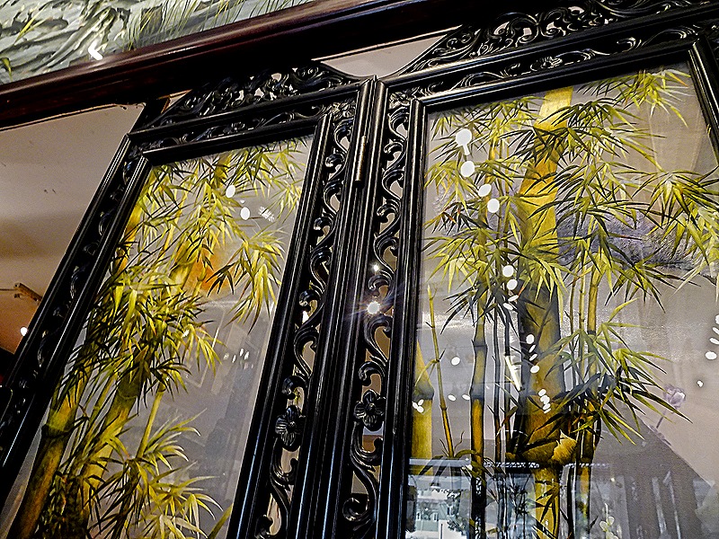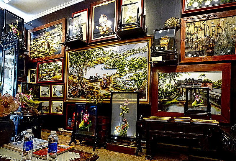 Just two weeks earlier, in Suzhou, China, we had visited an institute where we watched silk embroiderers at work. https://baderjournal.com/2024/08/26/shanghai-china-day-2-suzhou-2024/ It is very painstaking work using silk threads that are so thin as to be barely visible and the production of a midsize embroidery can take many months. We spent a good deal of time exploring this shop in Saigon, which had three stories full of framed silk embroideries in a large variety of shapes, sizes and designs. One of the shop ladies was working on an embroidery in the front of the shop during our visit. While all of these works were beautiful, we were particularly taken with the two sided embroideries, stitched on a sheer see through (silk?) canvas that could be viewed from both sides. Most of these were mounted in carved wood framed screens.