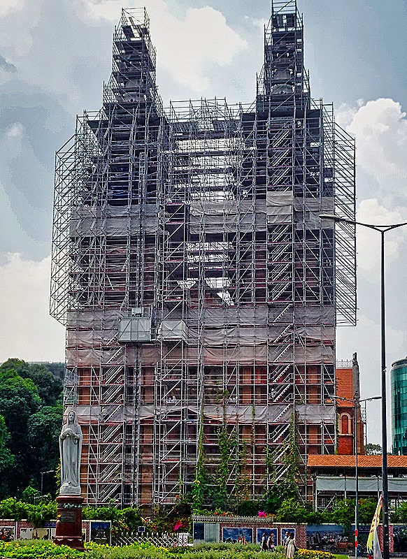 We walked quite a way back to the center of town and saw several landmarks we had visited before. We saw the old presidential palace (now a museum) in the distance as we crossed a street in front of its park. The facade and towers of Notre Dame Cathedral, built by the French, were covered in construction scaffolding, apparently getting a renovation. Across the street was the General Post Office, which was so full of visitors we only stayed briefly. The portrait in the distance in the post office is Ho Chi Minh.