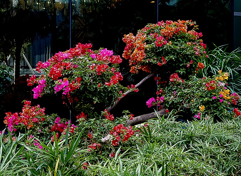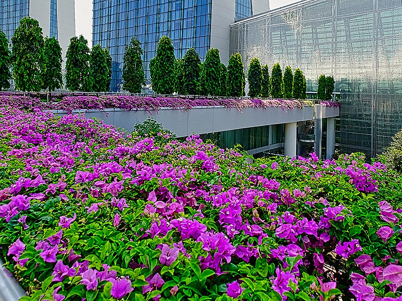 We decided to spend our first day walking around Singapore on our own, since we were already pretty familiar with the town. We set out Just after breakfast. The day was very sunny but also very hot and humid. On our way to the Sands hotel, an icon in Singapore, we walked past the Gardens by the Bay, which we had visited on our last visit. While we only walked along the edge this time there were many colorful flowers to see.